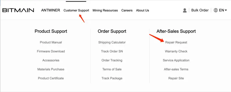 Visit the official BITMAIN website (www.bitmain.com), click on “customer support” at the top of the page, and select “repair request”.