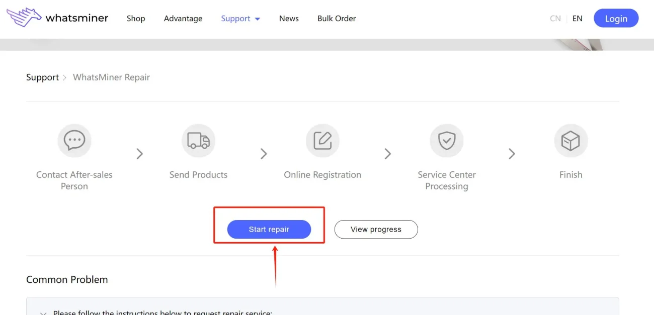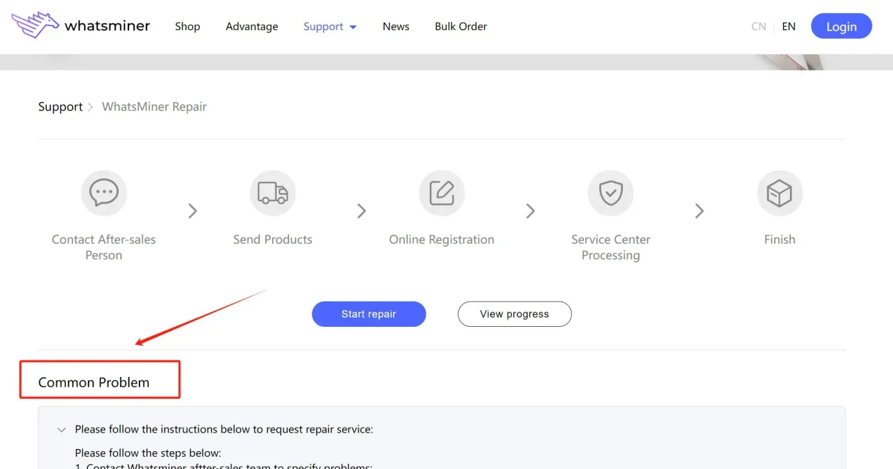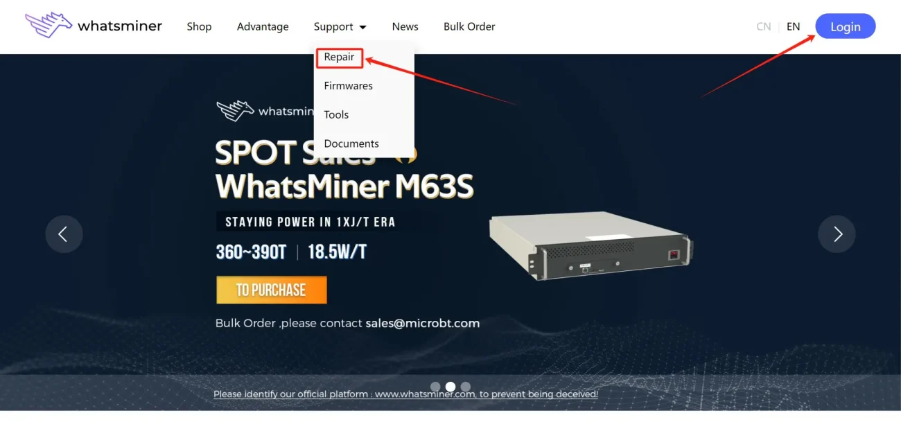 1. Visit official whatsminer website and login your account. Then click “Repair” to enter the repair page.