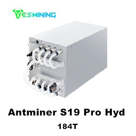 Model Antminer S19 Pro Hyd (184Th) from Bitmain mining SHA-256 algorithm with a maximum hashrate of 184Th/s for a power consumption of 5428W.