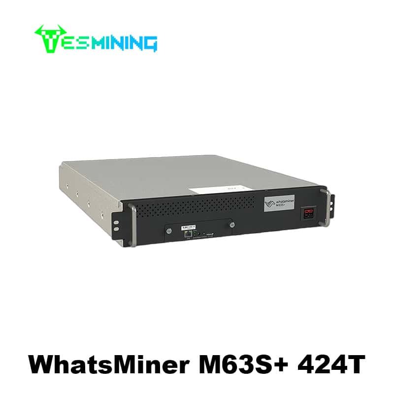 WhatsMiner M63S+ from MicroBT mining SHA-256 algorithm with a maximum hashrate of 424Th/s for a power consumption of 7208W.