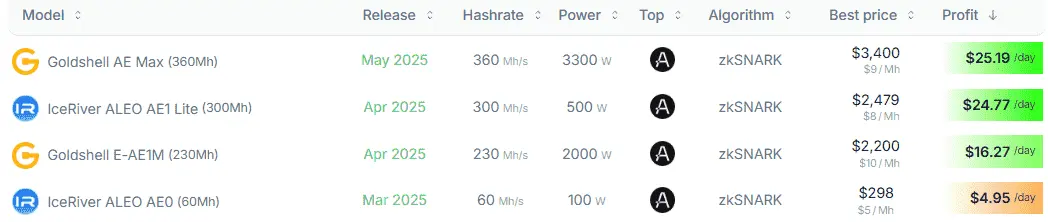 Like the Iceriver AE0 have gained popularity among home miners, while powerful machines such as the Goldshell AE Max and Iceriver AE1 Lite continue to push the boundaries of Aleo mining performance. With improved efficiency and lower energy consumption, these Aleo miners are reshaping the ALEO mining landscape and setting new standards for zk-SNARK algorithm-based mining.